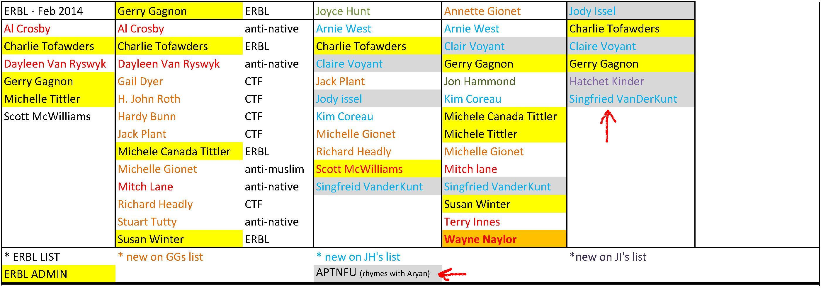 The long-term participation of the APTNFU coterie in the activities of both ERBL and INMR presents important questions about the goals of those organizations. The backgrounds of the APTNFU people – and their ultra-racist tendencies – are part of the public record. Their regular interactions with ERBL are clearly troublesome for any legitimate political organization – or legitimate political activist. Note how Gerry Gagnon always seems to be the front man when dealing with these people: