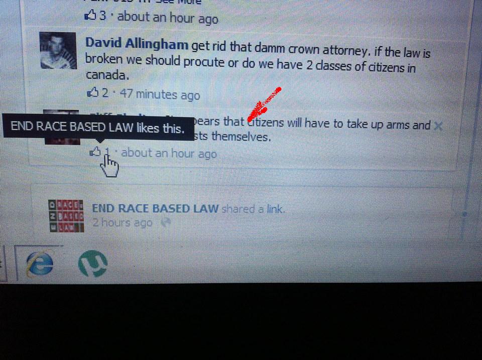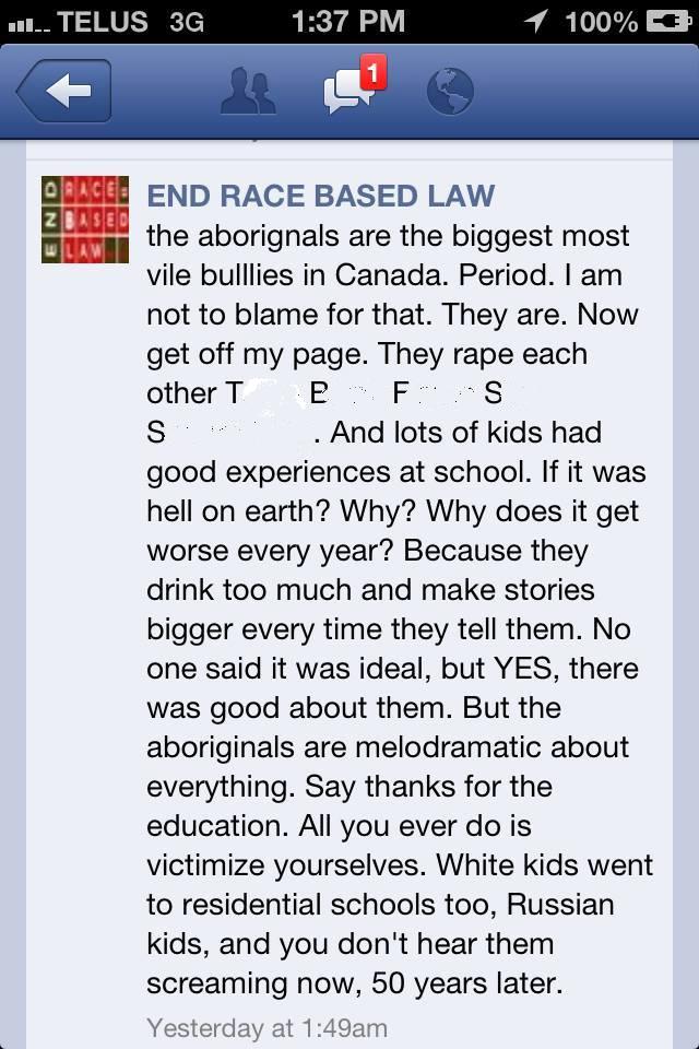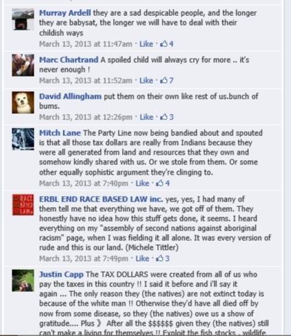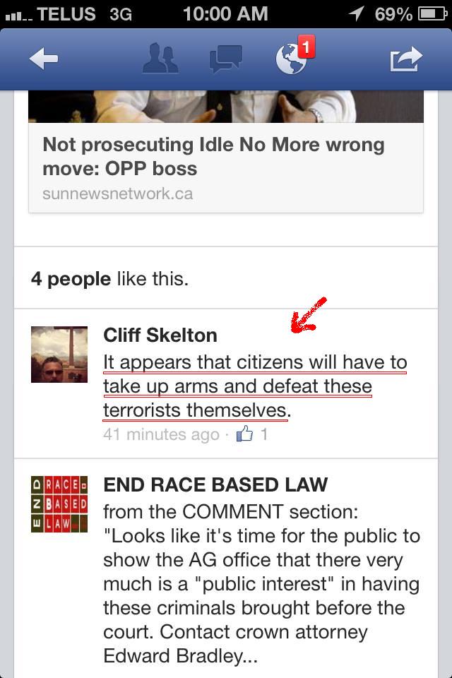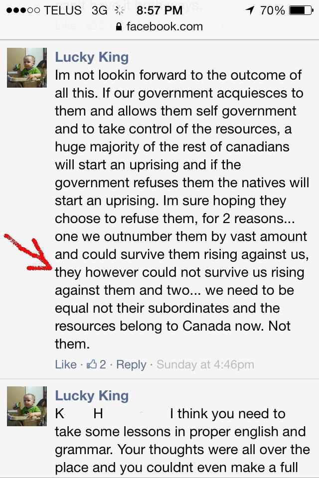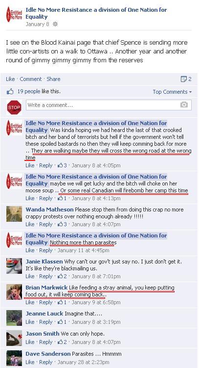 Here are explicit incitements to violence on a public, moderated Facebook page – with the moderator – Gerry Gagnon – clearly present; and violent comments are left to stand in a way that no opposing voice would be allowed. Gerry in fact has nothing to say other than to point out that “Obama” must have something to do with it; and the it’s just more ‘”Indigenous Peoples” nonsense’. All typical “intellectual” discourse for a hate-filled echo chamber.