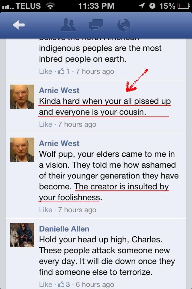 And here’s a good example of the kind of folks that Gerry’s hanging out with on those friends lists and social media sites – salt-of-the-earth racists using everyday slanders along with insults against Native spirituality: