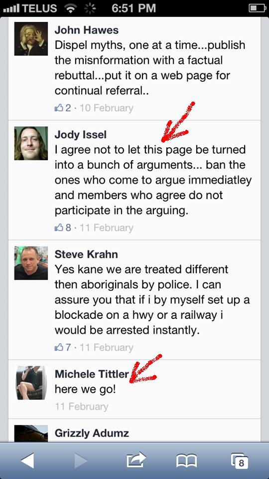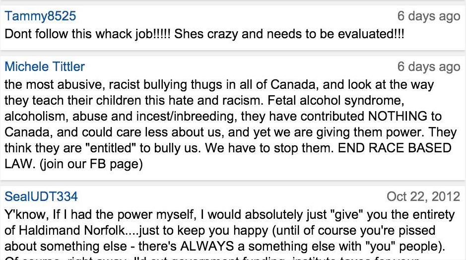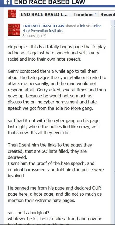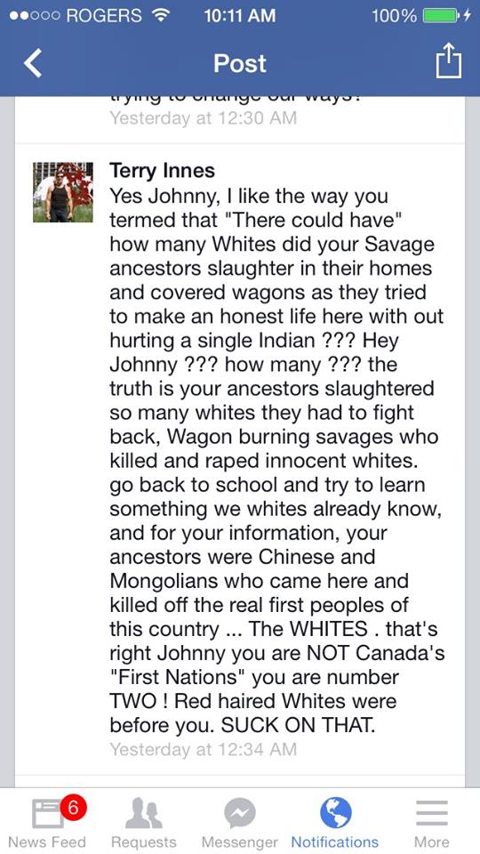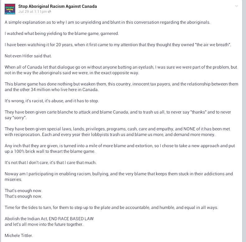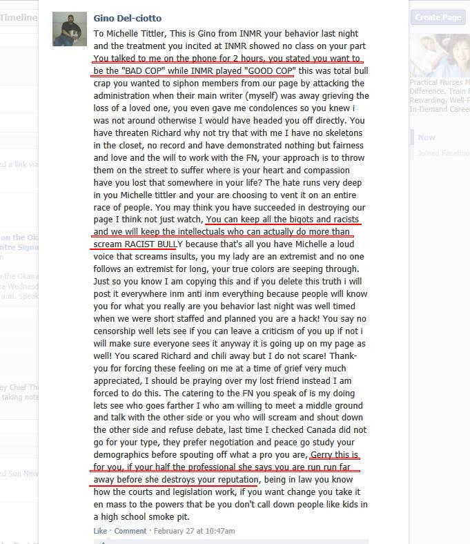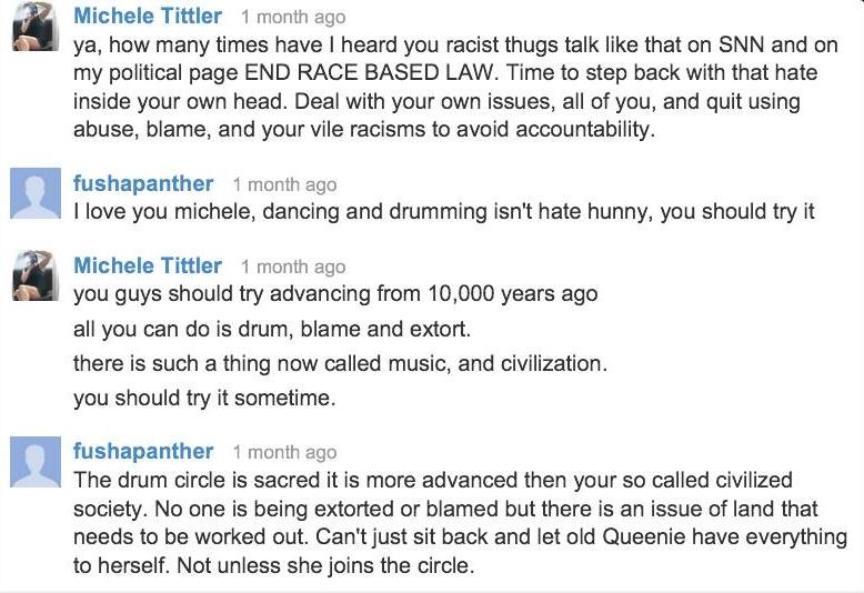 Under Naylor – under the tutelage of Tittler – and with the quiet support of Gerry, Idle No More Resistance has turned into something that is very different from Del-ciotto’s vision: constant calls for violence, completely obvious hate speech; self-evident dehumanization of First Nations people.