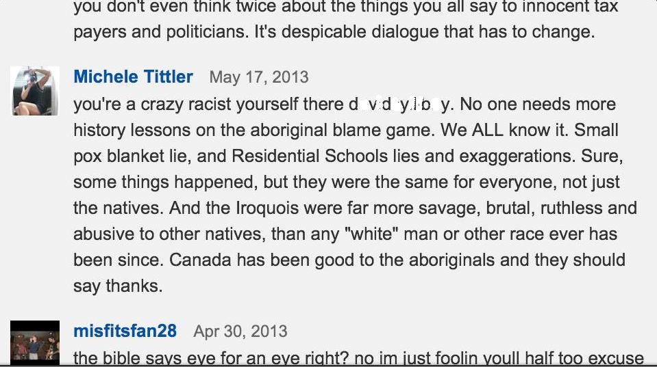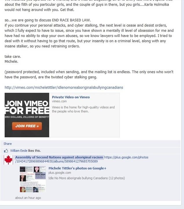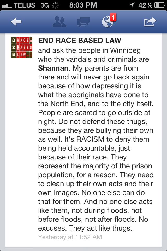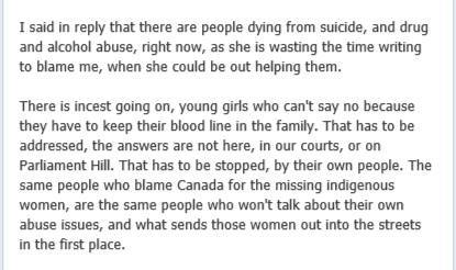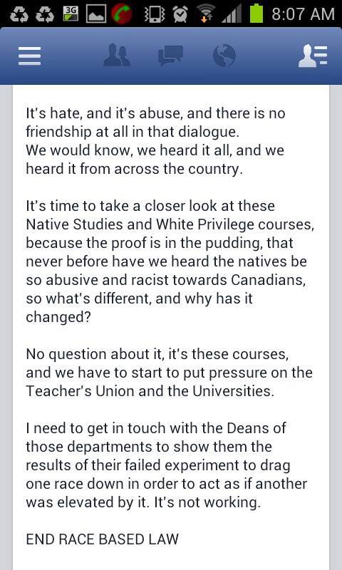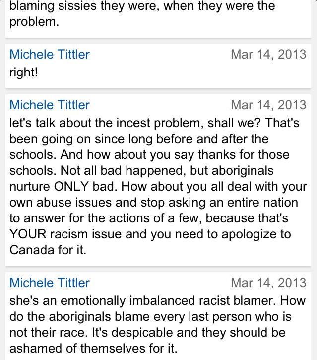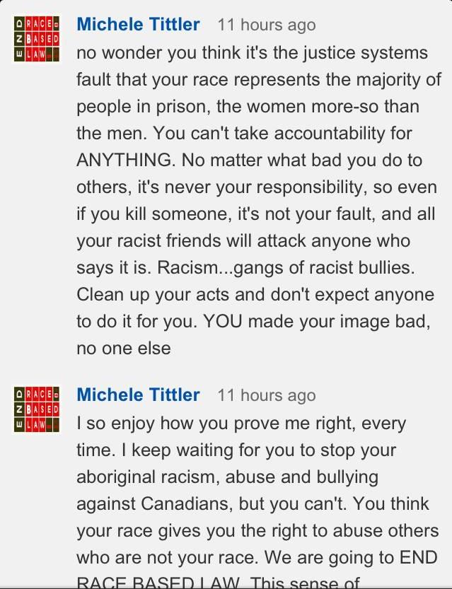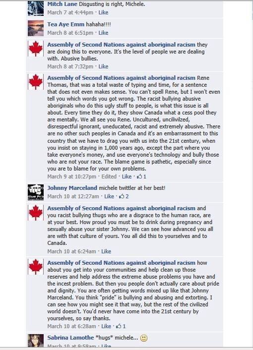 Under Naylor – under the tutelage of Tittler – and with the quiet support of Gerry, Idle No More Resistance has turned into something that is very different from Del-ciotto’s vision: constant calls for violence, completely obvious hate speech; self-evident dehumanization of First Nations people.