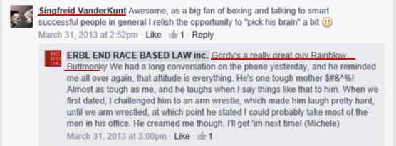 But happily, the arrogance of the principals of these groups leaves them telling more about themselves than they actually realize. Here “Singfreid VanderKunt” expresses love for ERBL – and is answered enthusiastically as “Butt”. Rainblow Buttmonkey is a friend of the admins for ERBL – and the prime administrator of the hateful APTNFU; Mickey lets us know that they’re one and the same person.