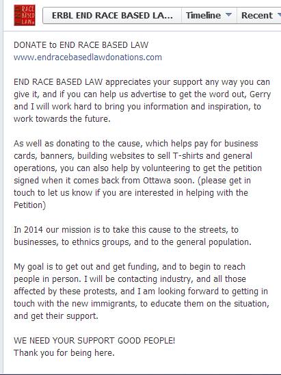 As previously described in Valentine to Tittler, ERBL’s “political work” has been inconsequential; they – and especially Gerry – have been concentrating on building their ties with the worst racist hate groups in Western Canada. What, then, is the plan for the money that they are so assiduously raising?