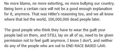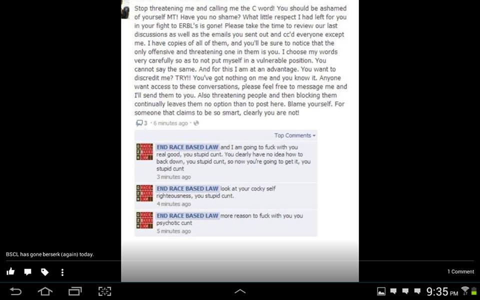 For the past few weeks we’ve been looking at End Race Based Law’s activities in the past year; its almost supernatural ability to generate hate speech and race-bait those who might think they’ll get a decent hearing from the ERBL crew; and the amazing way an “anti-racist” group can find itself in bed with racists of the most virulent kind; as well as a little bit about how Mickey operates – and the way she’s constructed on-line personas to suit her needs