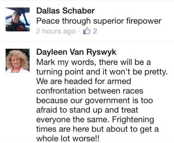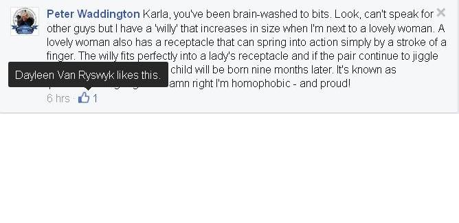 To demonstrate that she’s an equal opportunity hater, here’s a short section from her personal Facebook page: “Dayleen Van Ryswyk likes this”