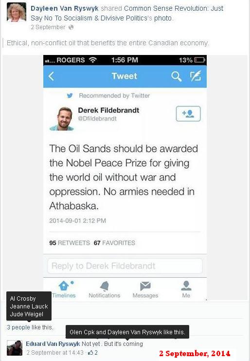 Dayleen has been diligently reaching out for a year – even as her second by-election campaign failed miserably – as she tried to make political connections everywhere on the right: here, with the Canadian Taxpayers Federation – with an attendant set of “likes” from various supremacists. Note especially her hubby’s interjection: it will become a regular theme in the Van Ryswyk discourse