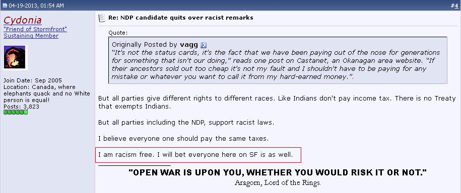 Compare her words – and her message – to those of some of her earliest “free speech” supporters: Stormfront – the nadir of White Supremacy in Canada.