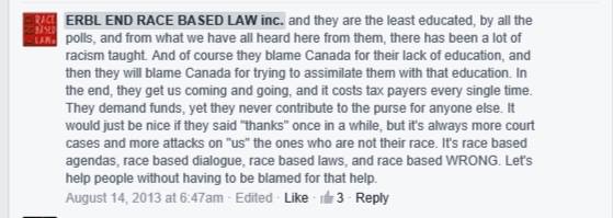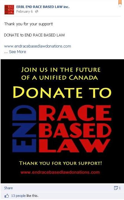 At this point, we’ve seen a great deal of End Race Based Law’s activities in the past few years; its almost supernatural ability to generate hate speech and race-bait those who might think they’ll get a decent hearing from the ERBL crew; and the amazing way an “anti-racist” group can find itself in bed with racists of the most virulent kind.