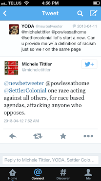 An equal opportunity hater – so long as the other person has some idea of First Nations’ rights. Here she reflexively accuses someone of being both assimilated and racist – though it’s unclear what their ethnicity might be…
