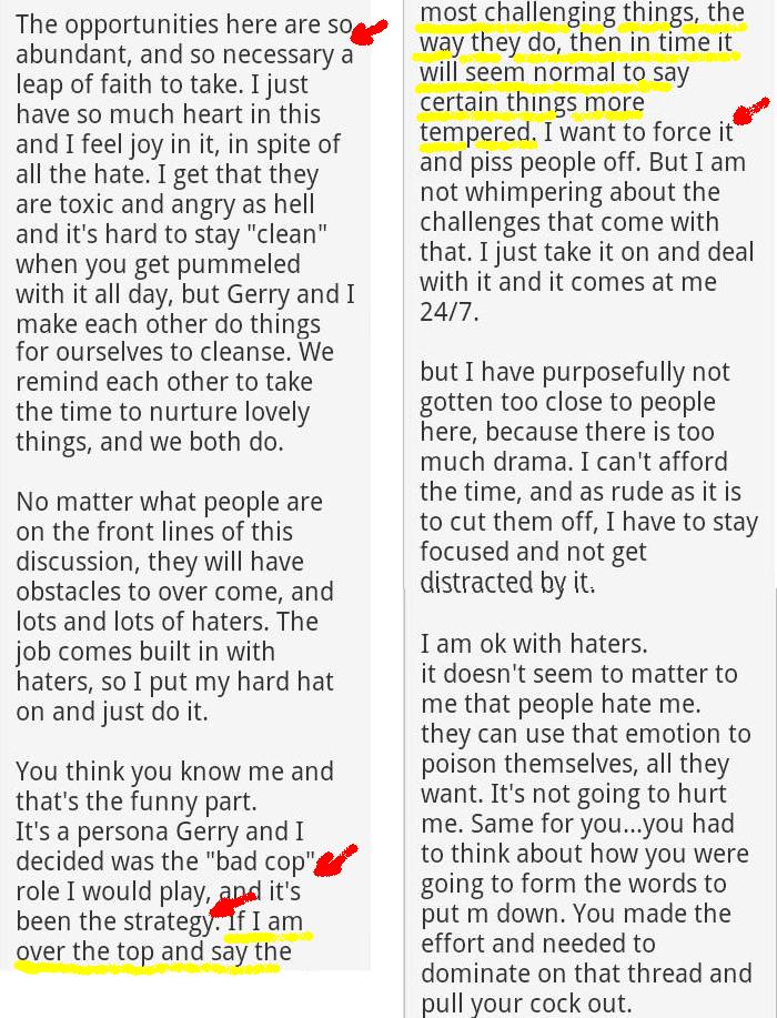 She works hard for it. But sometimes – rarely – you get to see the other side of her. In this message, she isn’t presenting herself in public: she’s communicating with a former ally who she’s been alternately importuning and taunting for months – since a significant online snit: